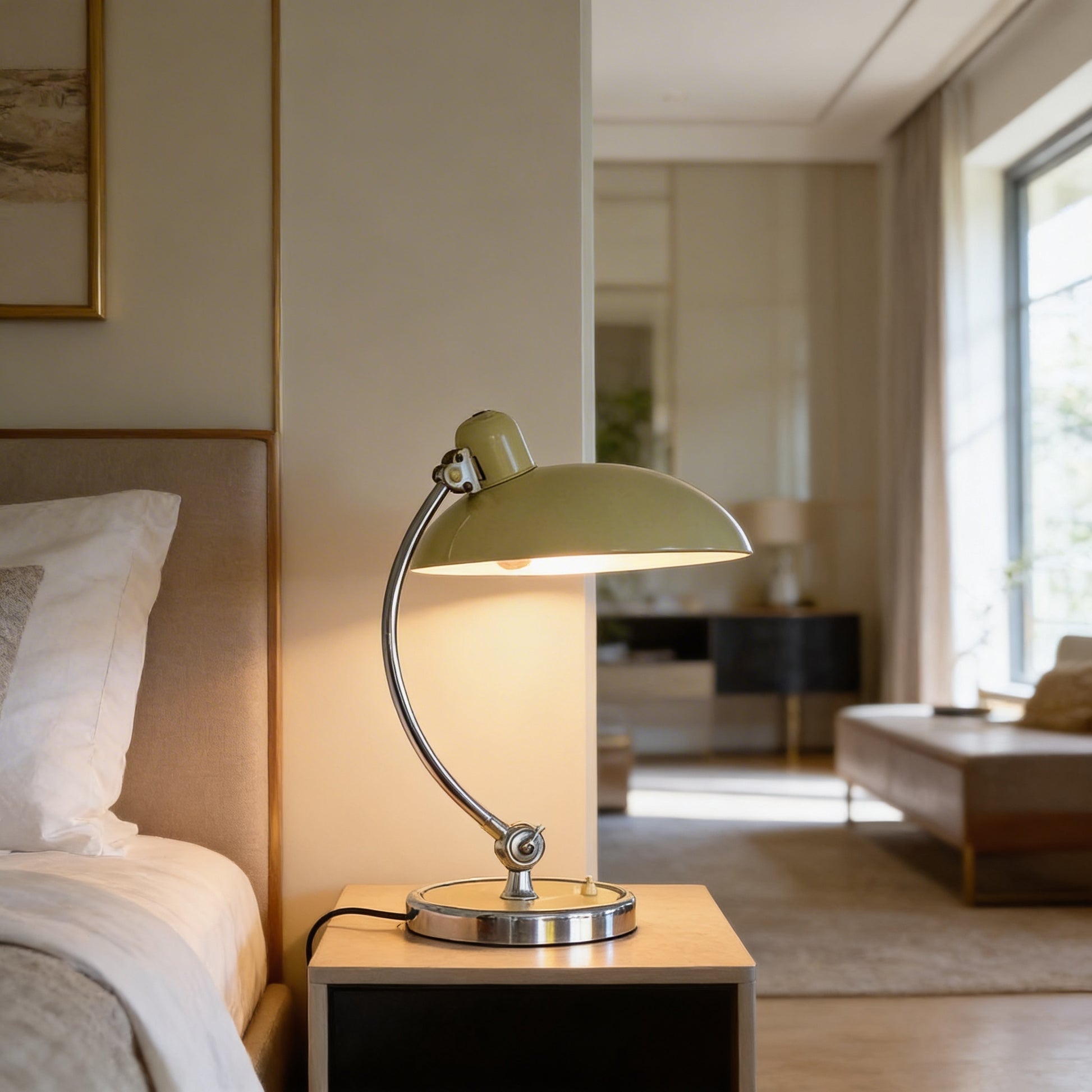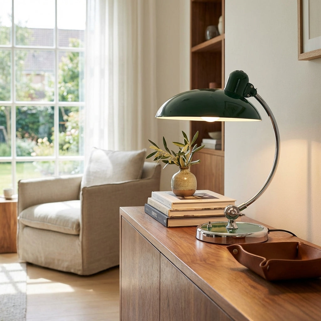Some lamps are bought. The Dell is chosen. It has the kind of presence that makes a room feel finished — the clean arc of the arm, the weighted glass shade, the push of a button that drops the light exactly where you want it. It is a lamp that has been right since 1931 and has not needed to change since.