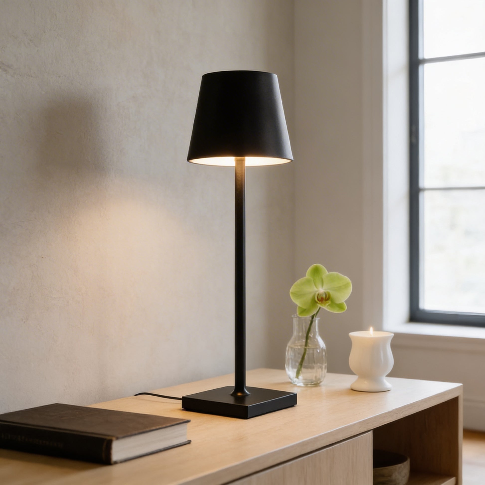 Crafted from hand-finished iron with a slender, considered silhouette, the Glim is the kind of object that earns its place in a room even when it's switched off. The matte black body holds its shape in daylight — architectural, still, deliberate. At night, a single touch wakes it. Hold longer and the light dims slowly, exactly as far as you want it. Three colour temperatures let you shift from the cool clarity of task light to the deep amber warmth of candlelight.