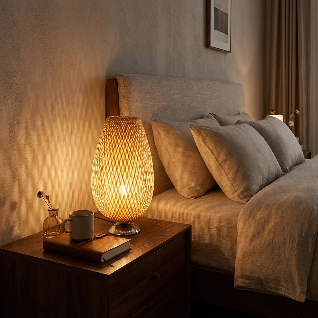 The Vaeler sits on a bamboo pedestal base — clean, considered, grounded. The oval shade casts the light softly outward through the weave, throwing a pattern of warmth across the surfaces around it. In the evening, it transforms a bedside table into a place worth sitting beside. In the morning, it holds its shape as a sculptural object — something that earns its place on any surface it touches.