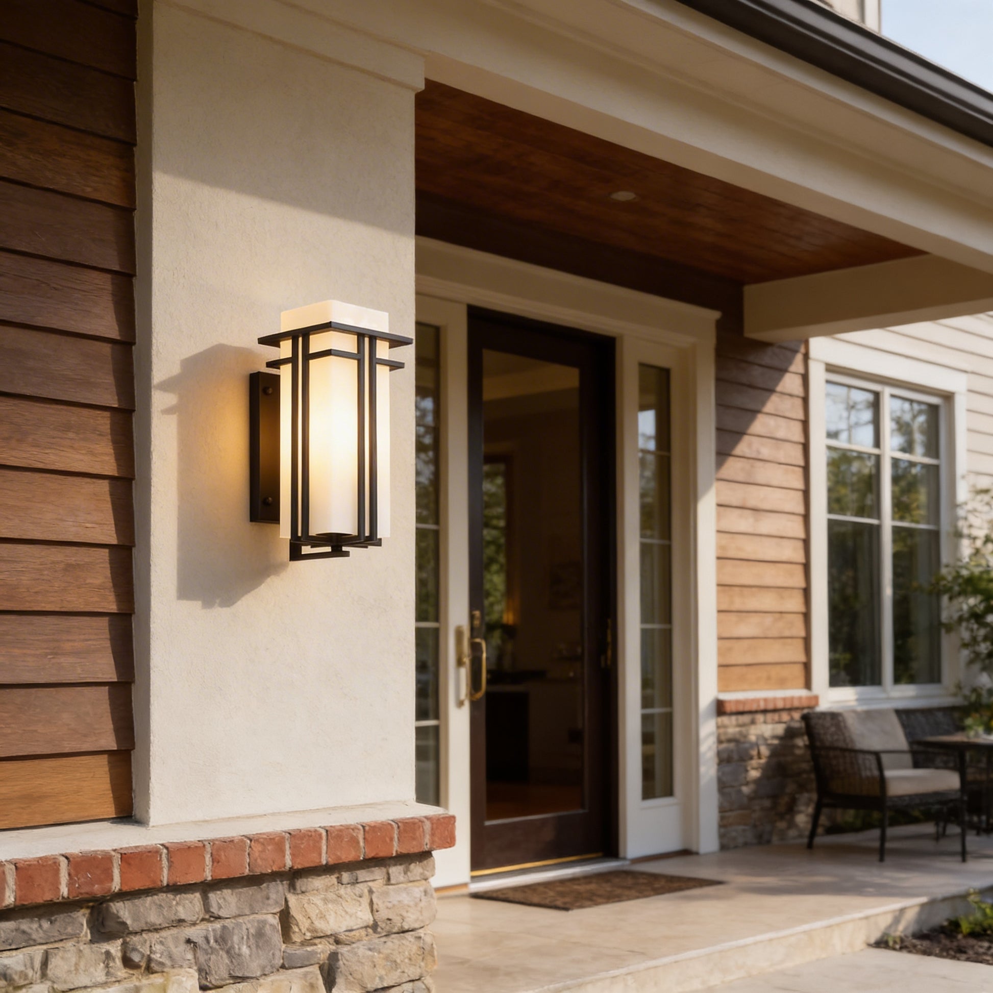 The form is architectural. Clean vertical lines, a frosted glass panel that diffuses the light without softening its presence, and a matte black iron frame that holds its finish through every season. The Halo is hardwired and built to stay — not a temporary fixture, but a permanent decision about how your home presents itself to the world.