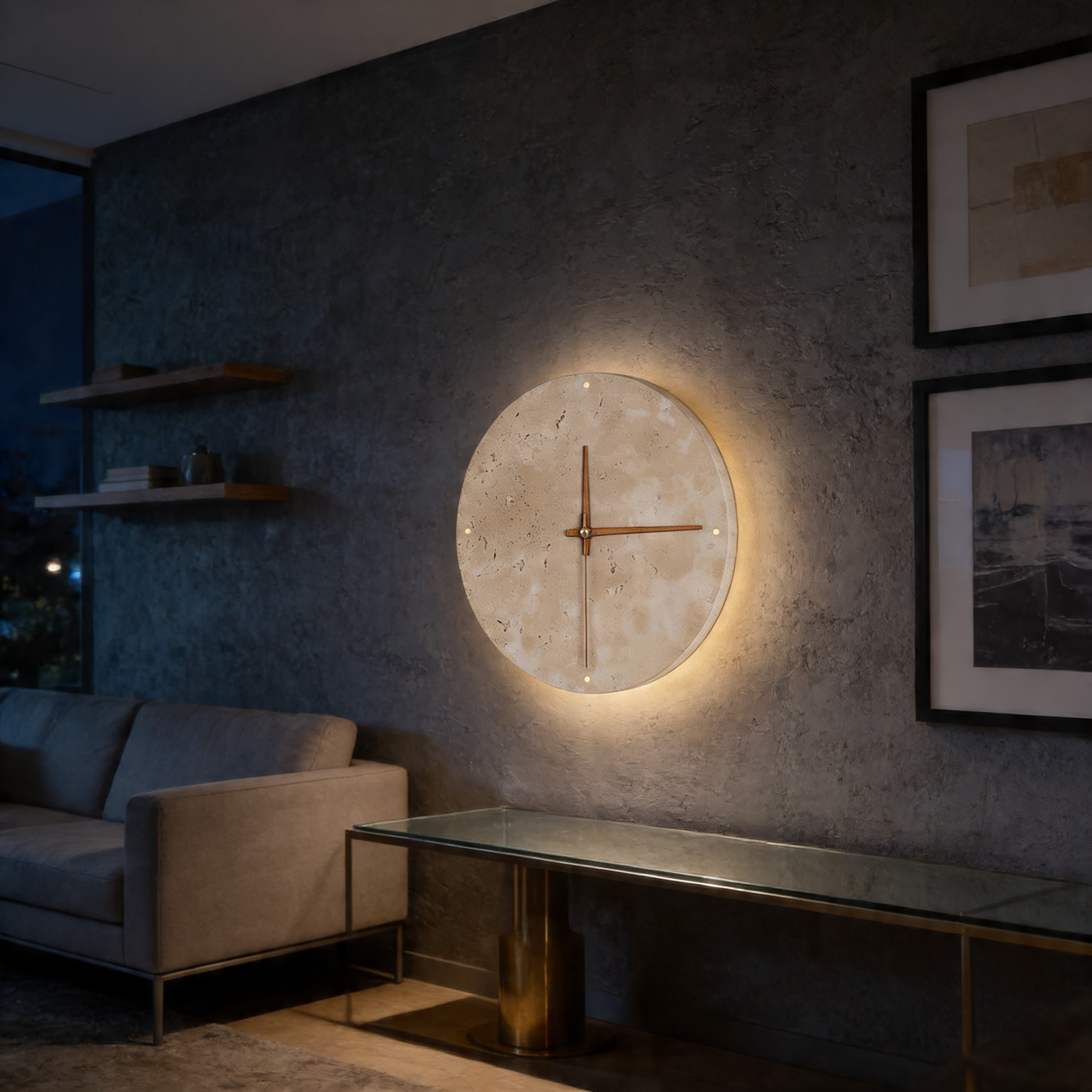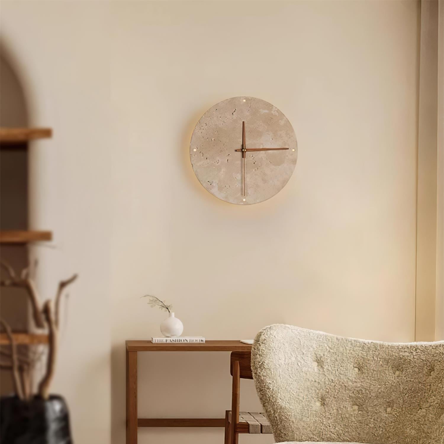 Some wall pieces simply tell the time. The AURO Horologe | Travertine Clock Lamp does more — it brings together light, natural stone, and quiet design into a single, refined presence. This travertine wall lamp with integrated clock offers gentle illumination and practical function, creating an atmosphere that feels balanced and timeless.