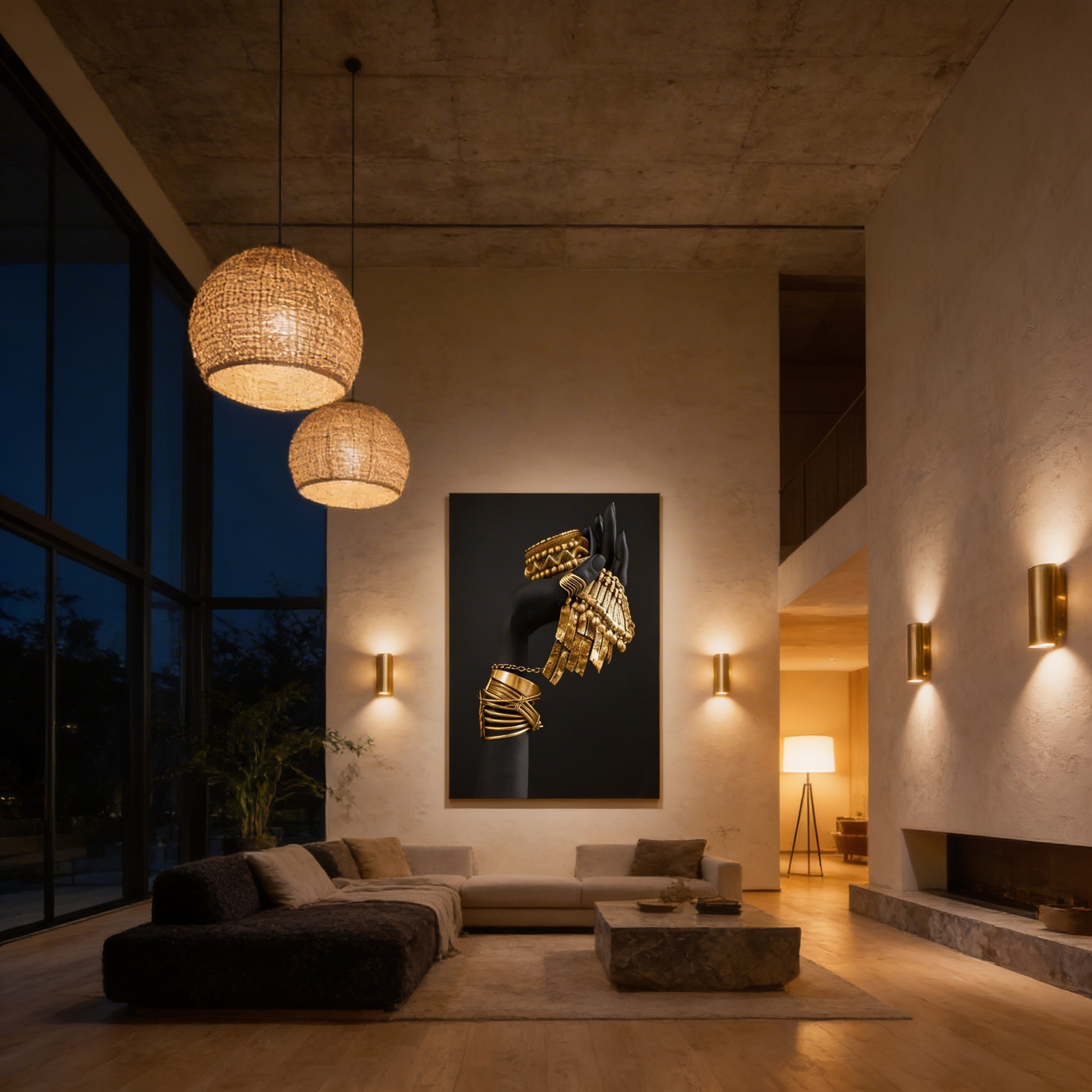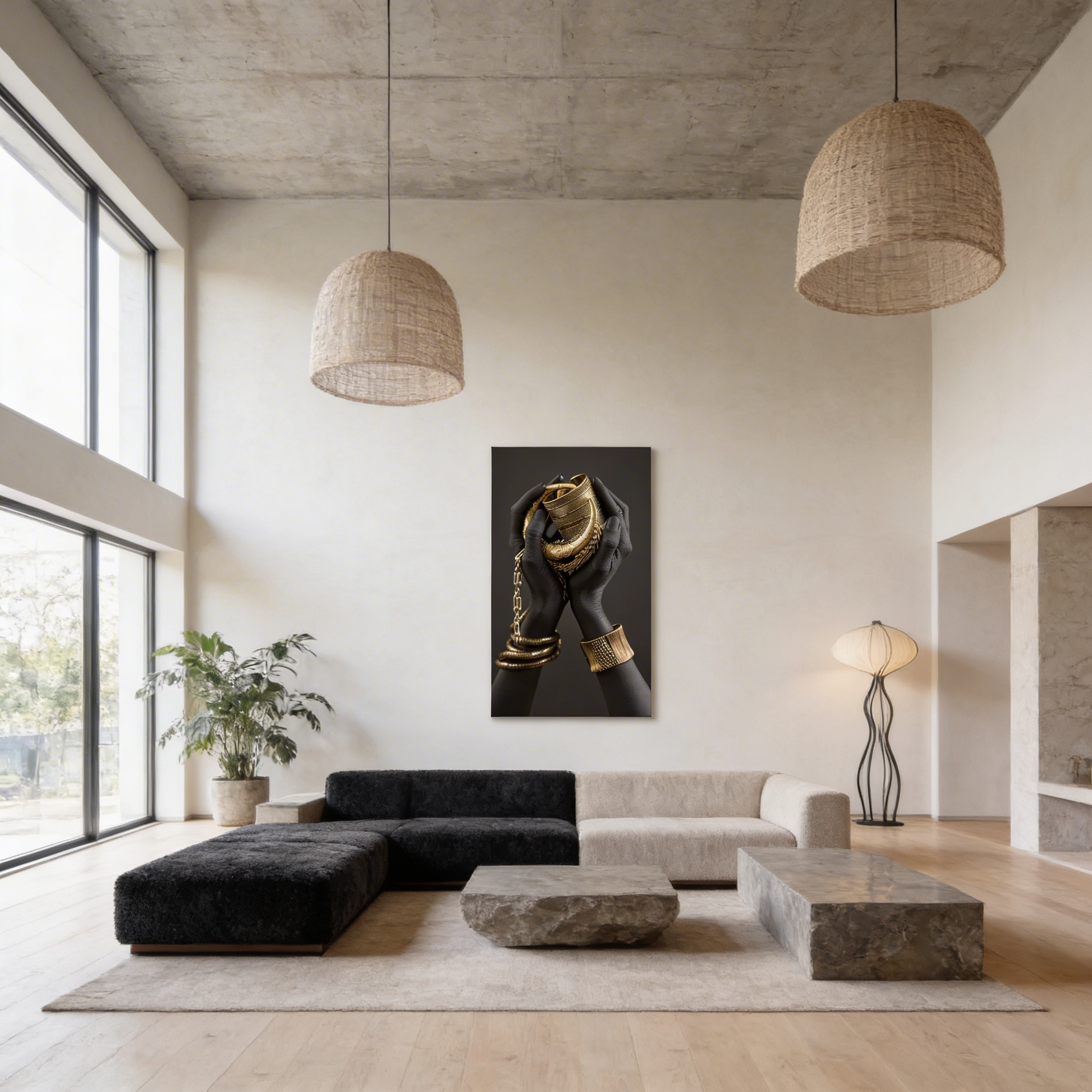 • Q: Is this design suitable for modern interiors? A: Yes. The deep black background, sculptural hands, and metallic jewellery tones make it a strong fit for modern, moody, luxury-inspired, and gallery-style spaces.