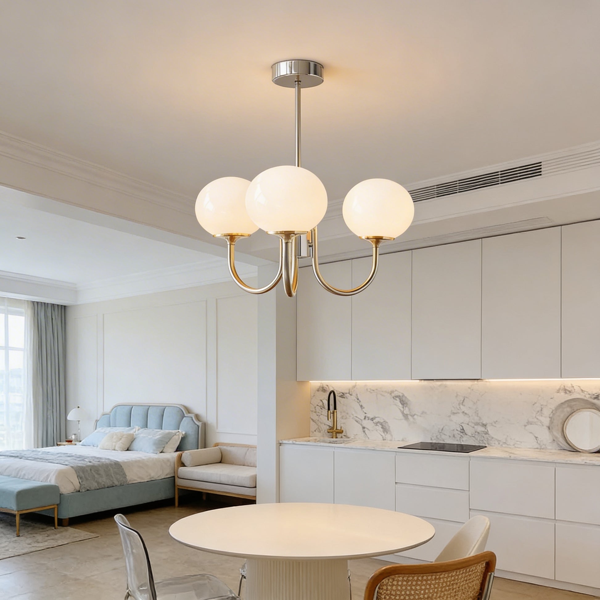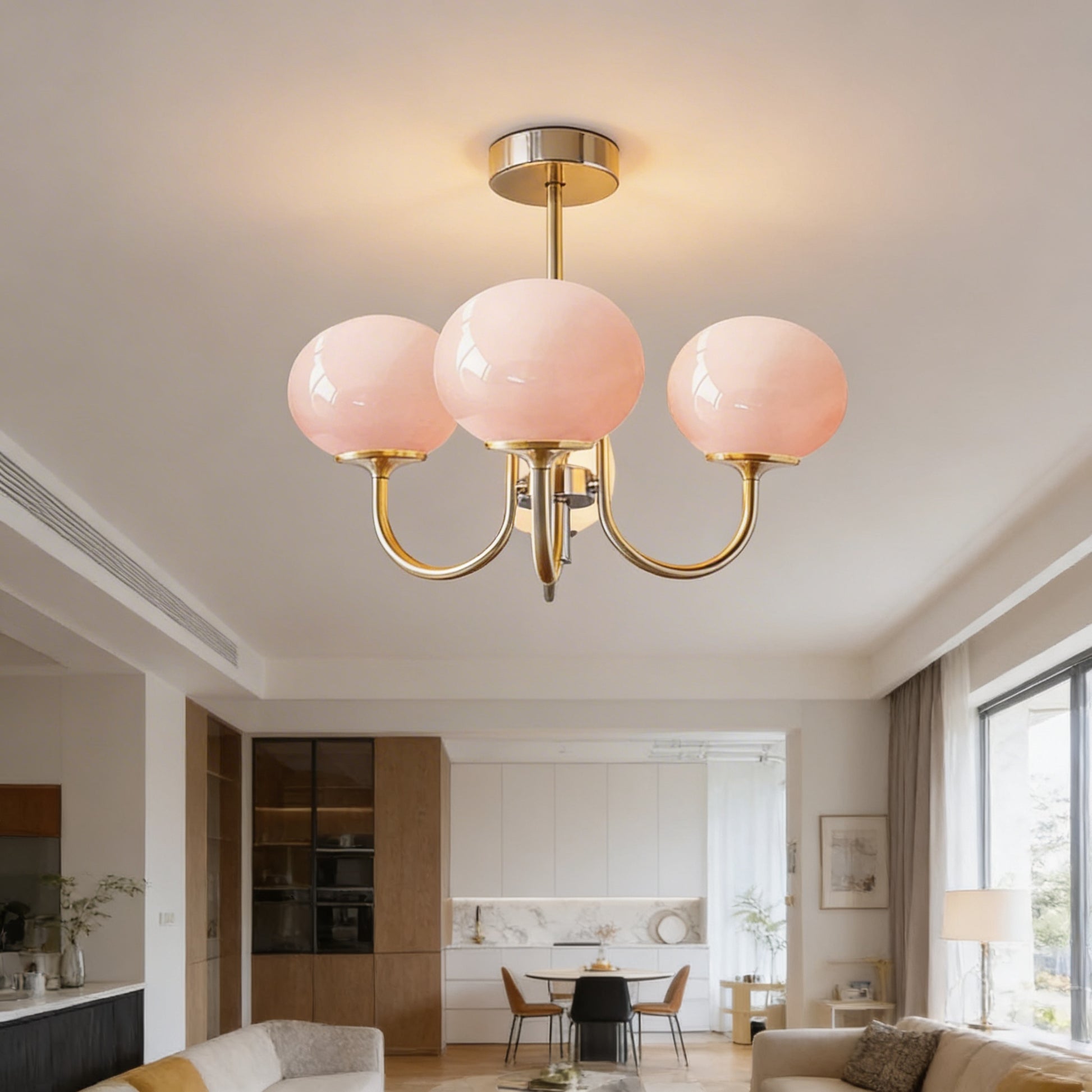 The globes are glass, finished in your choice of soft pink or cream white, mounted on an iron frame in either a warm copper or cool silver tone. The 3-head configuration spans 50cm — the right scale for a bedroom or dining nook. The 5-head spans 68cm — built for larger dining rooms, open-plan living spaces, or anywhere the ceiling needs to earn its place. Both configurations hang on adjustable cords, so the drop is yours to set.
