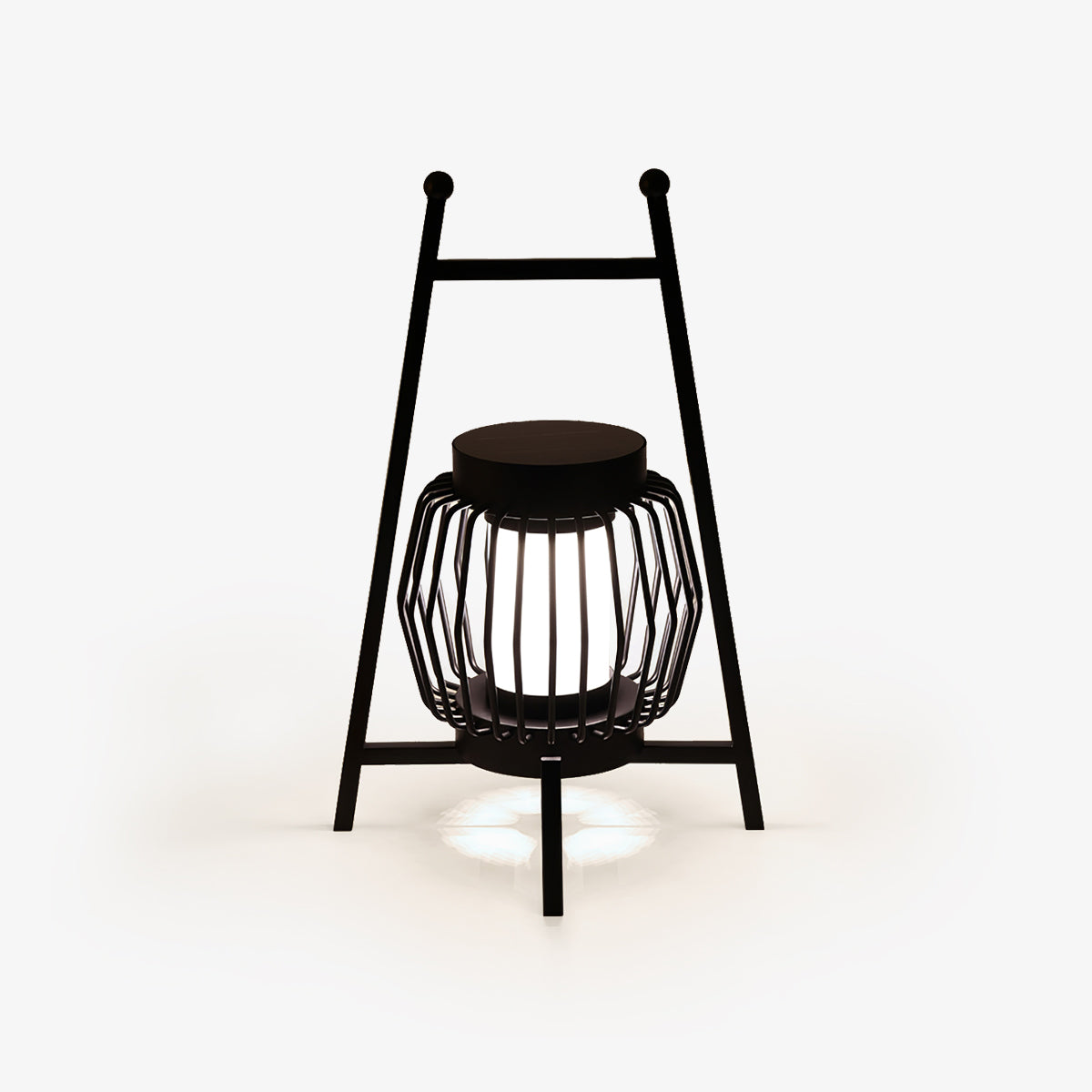 The Grau is built around a woven bamboo and rattan frame mounted on a slender tripod stand. The form is deliberately organic — a counterpoint to hard edges and polished surfaces. It belongs on a garden dining table, beside a fire pit, at the edge of a terrace. It charges silently through the day via the integrated solar panel and casts its warm glow from dusk until the evening is done.