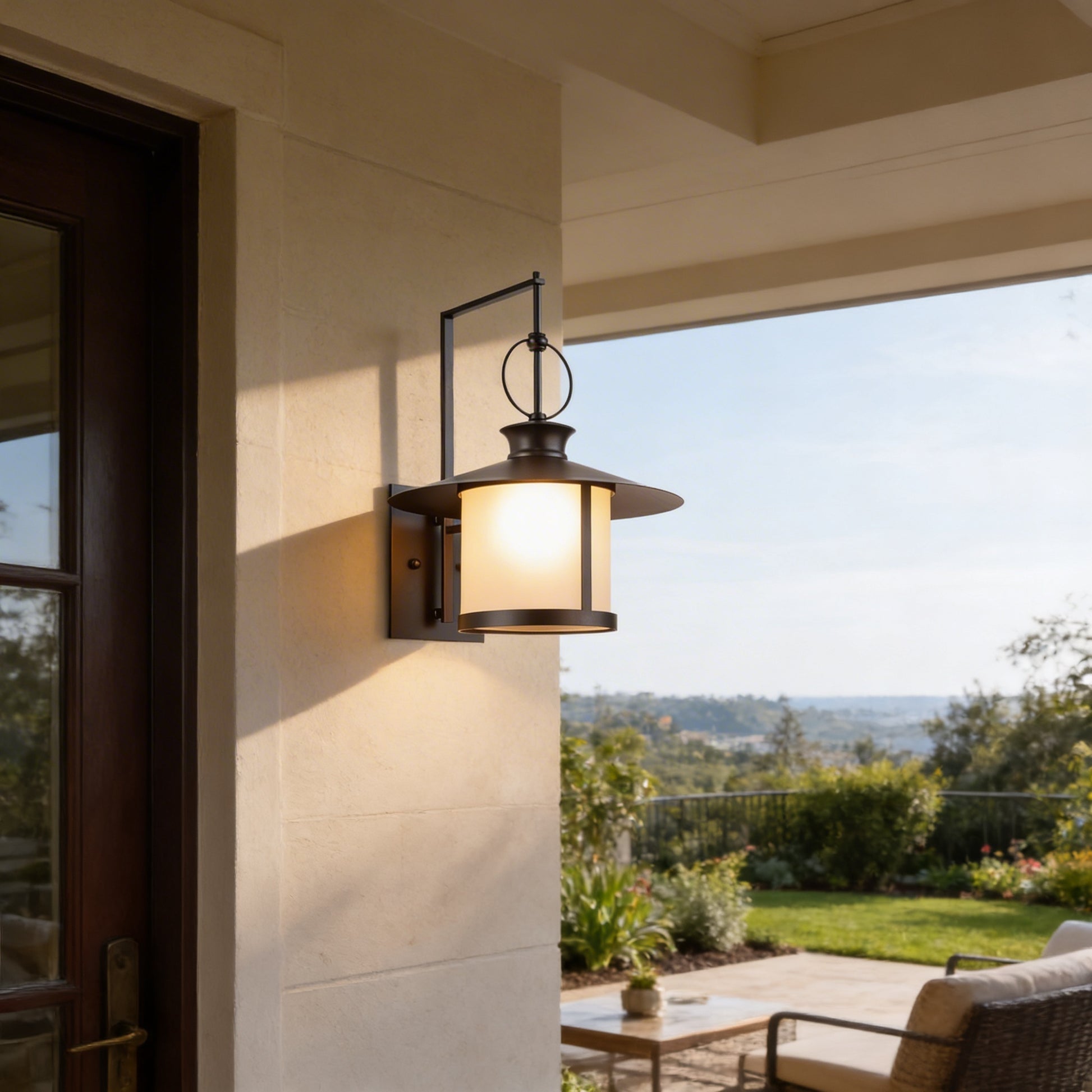 The form is deliberate. A wide-brimmed metal shade sits over a frosted glass diffuser, casting warm, even light across the wall and the ground below. The black finish is matte and considered — the kind of thing that reads as intentional against rendered walls, timber cladding, or bare brick. It does not try to disappear. It earns its place.